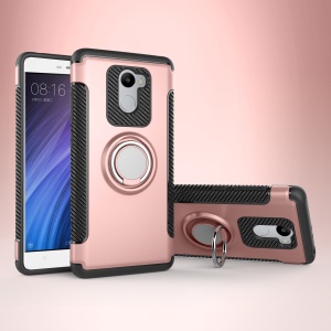 Carbon Fiber Texture TPU PC Hybrid Cover Magnetic Car Mount Ring Holder Kickstand for Xiaomi Redmi 4 - Rose Gold