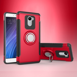 Magnetic Ring Holder Carbon Fiber Texture TPU + PC Hybrid Mobile Phone Case for Xiaomi Redmi 4 - Red