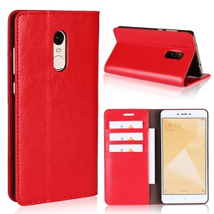 For Xiaomi Redmi Note 4X Crazy Horse Grain Genuine Leather Wallet Cover Accessory with Stand - Red