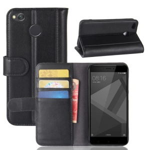 Genuine Split Leather Wallet Mobile Phone Case with Stand for Xiaomi Redmi 4X - Black